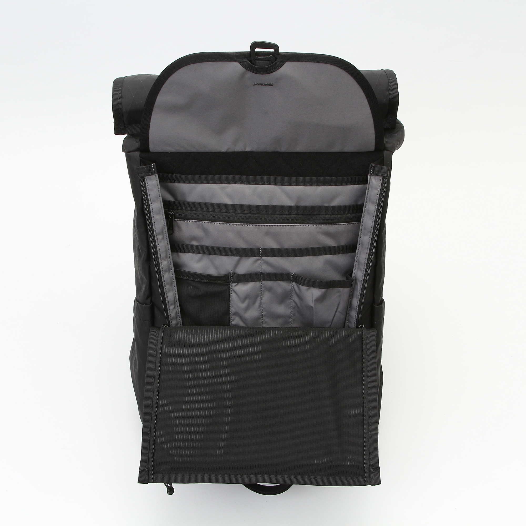 フロントポケットの両サイドにジップを採用し、フルオープンでの可視化とサイドジップからの内部アクセスが格段に向上